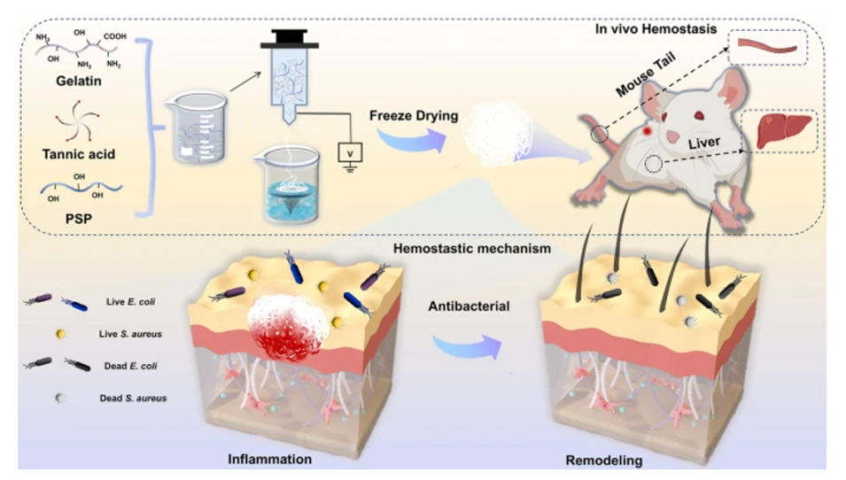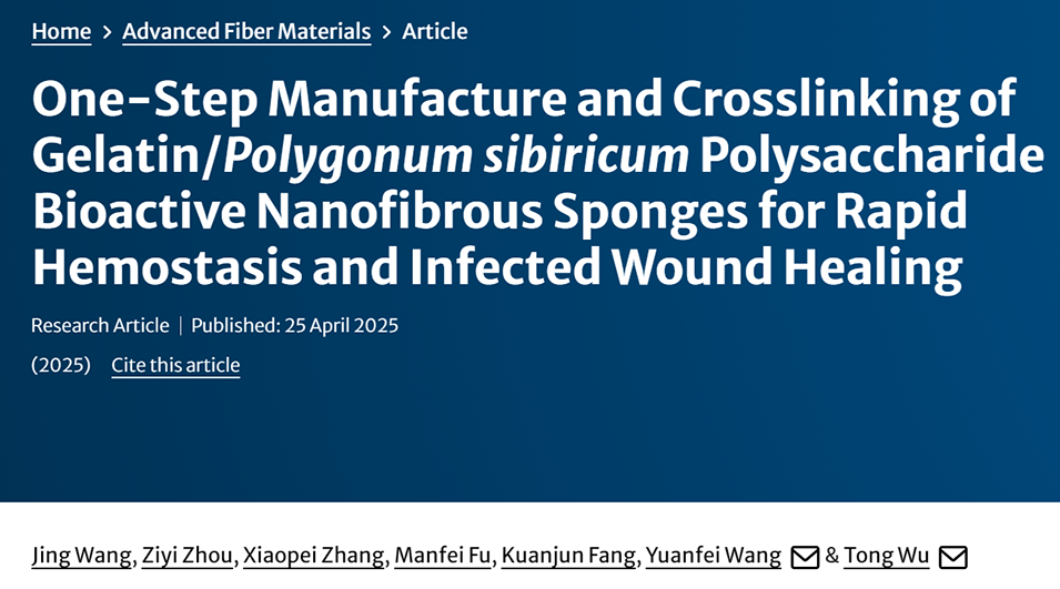 在军事和临床环境中,不受控制的出血和伤口感染的发生是造成死亡的一个重要原因,特别是在创伤性损伤的情况下。在这方面,开发一种有效的方法来促进快速止血和治疗感染伤口具有重要的意义和价值。基于此,青岛大学吴桐教授在期刊《Advanced Fiber Materials ( IF 17.2 )》上,发表题目为“One-Step Manufacture and Crosslinking of Gelatin/Polygonum sibiricum Polysaccharide Bioactive Nanofibrous Sponges for Rapid Hemostasis and Infected Wound Healing”的论文,开发了一种用于快速止血和感染伤口愈合的纳米纤维海绵。