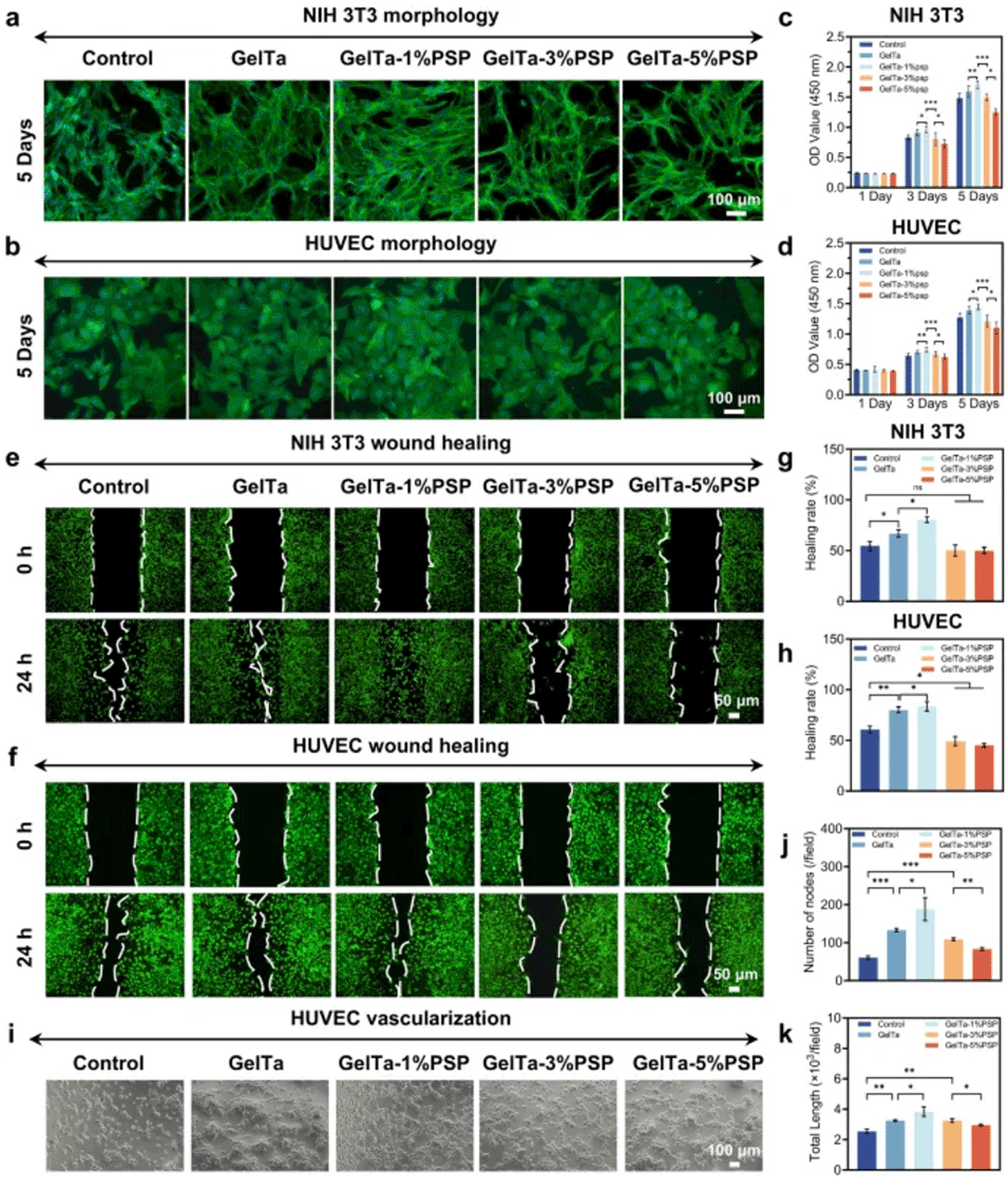 图3. GelTa-PSP 纳米纤维海绵的生物相容性。荧光显微照片显示 a NIH 3T3 和 b HUVEC 细胞分别与不同组海绵提取物共培养 5 天后,以载玻片作为对照。c NIH 3T3 和 d HUVEC 细胞在不同组海绵提取物上共培养 1、3 和 5 天后的活力。e NIH 3T3 和 f HUVEC 细胞与每组海绵提取物共培养 24 小时的迁移能力。量化与每组海绵提取物共培养 24 小时的 g NIH 3T3 和 h HUVEC 细胞的伤口闭合率。j 节点数和 k 总长度统计信息。