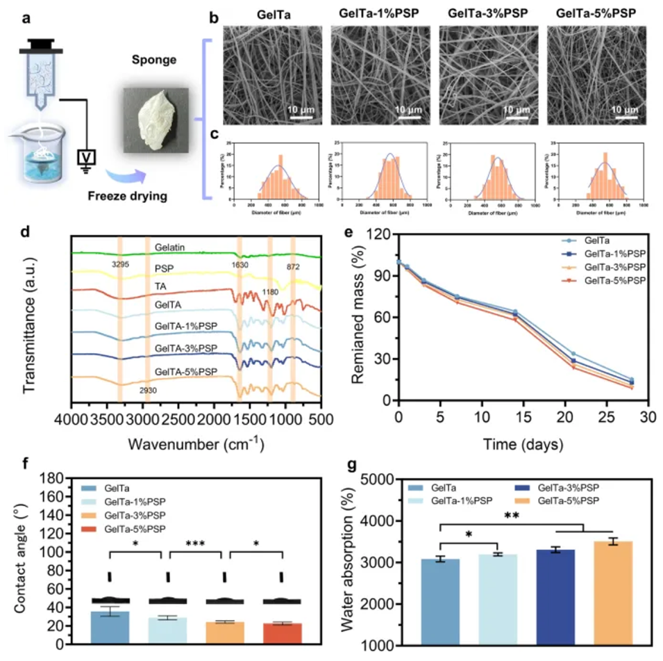 图1. GelTa-PSP 纳米纤维海绵的物理和化学表征。a GelTa-PSP 纳米纤维海绵的制备。纳米纤维海绵的 b SEM 图像(比例尺 = 10 μm)。c 纳米纤维海绵的直径分布。d FTIR 光谱。e 降解率。f 亲水性。g 吸水率。