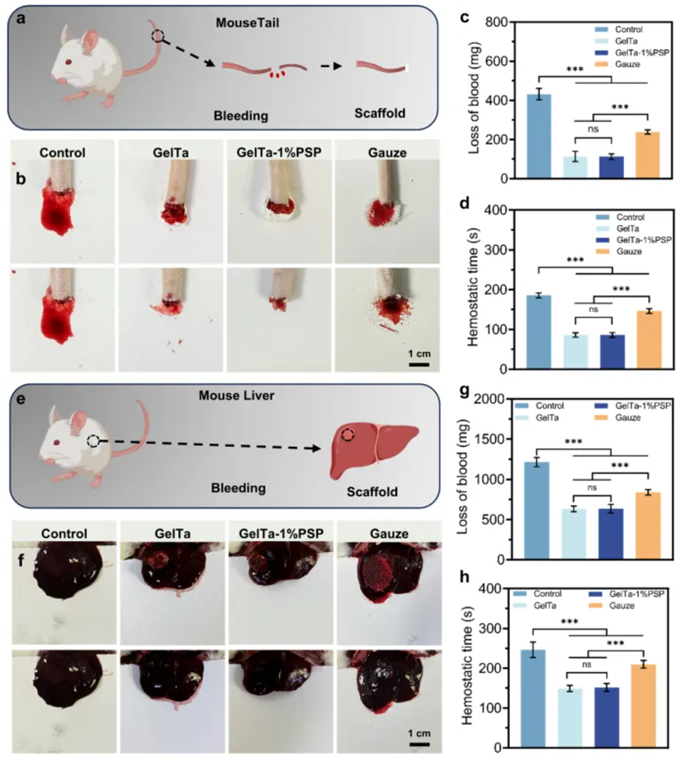 图5. GelTa-PSP 纳米纤维海绵的体内止血性能分析。a 海绵对大鼠止尾止血作用的示意图和 b 数字图像。c 大鼠断尾后失血。d 大鼠断尾止血时间。e 海绵对大鼠肝脏止血作用的示意图和 f 数字图像。g 大鼠肝脏失血。h 大鼠肝脏止血时间。