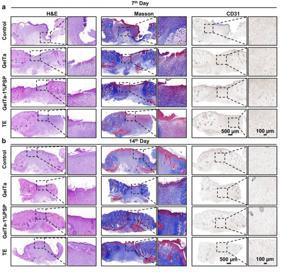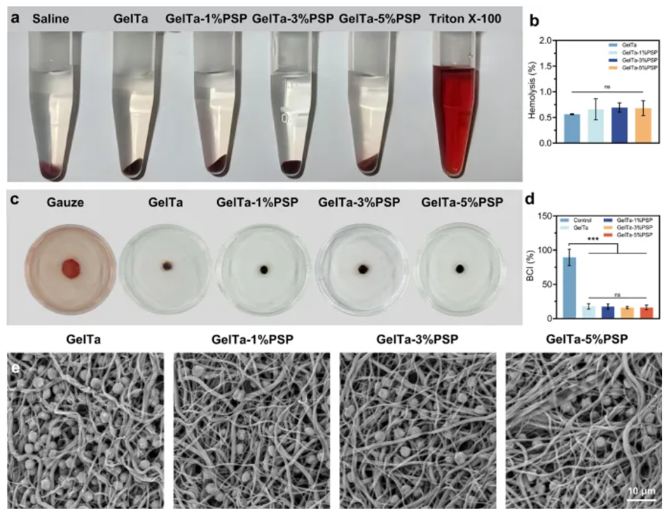 4、与医用纱布相比,GelTa-PSP纳米纤维海绵在大鼠断尾和肝损伤模型中具有有效的促凝功能和止血作用。此外,由于中草药类黄酮多糖的生物活性,GelTa-PSP纳米纤维海绵在感染大鼠的伤口愈合中表现出增强的性能。