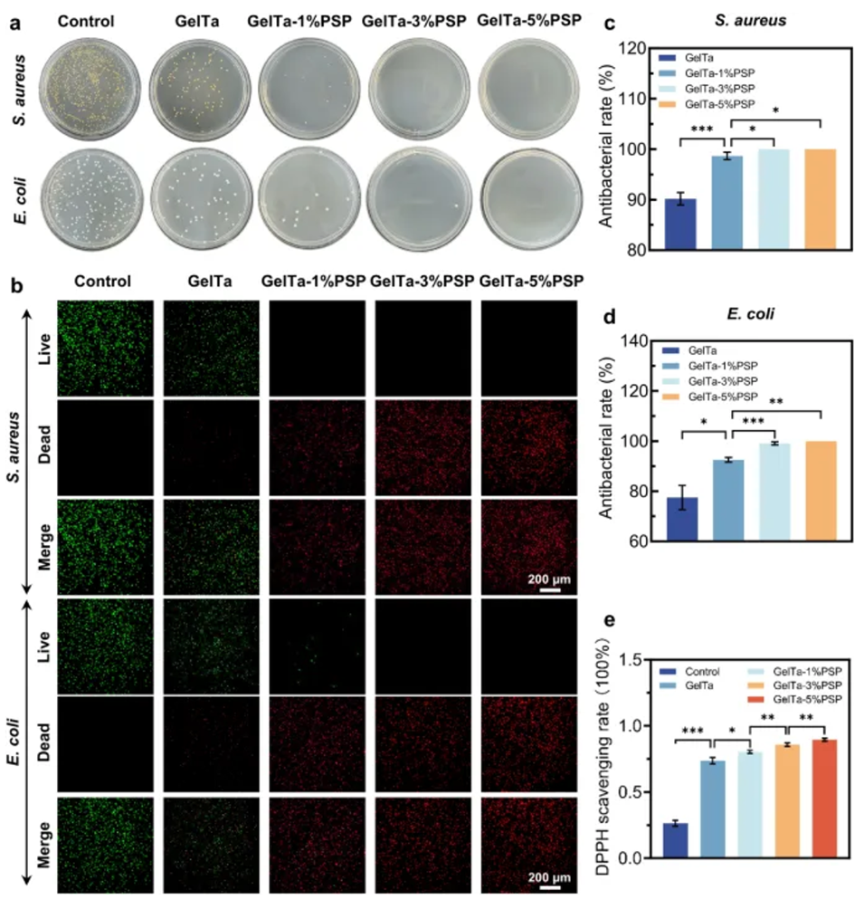 图2. 对金黄色葡萄球菌和大肠杆菌的体外抗菌活性和抗氧化特性。a 金黄色葡萄球菌和大肠杆菌菌落的数字图像。b 活/死染色的荧光图像(绿色:活;红色:死)。金黄色葡萄球菌和 d 大肠杆菌的抗菌率统计。e DPPH 自由基清除能力。