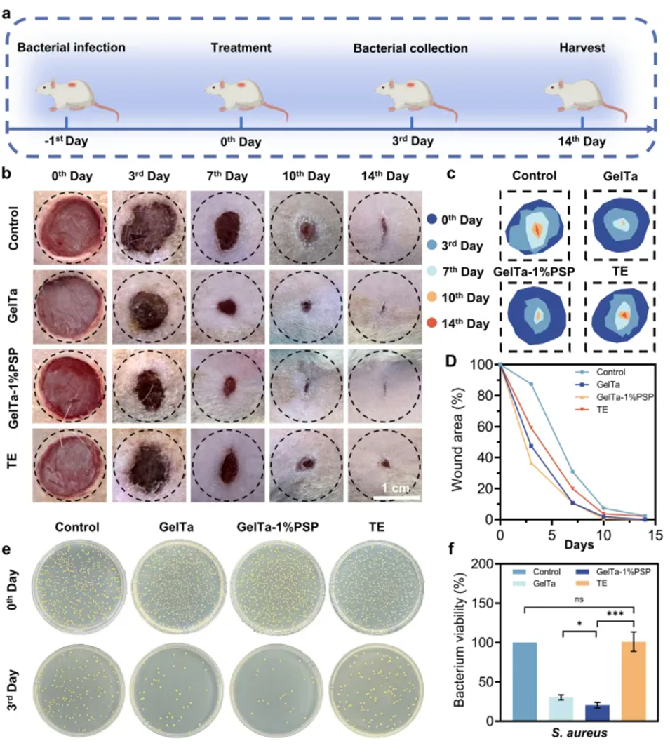 图6. GelTa-PSP 纳米纤维海绵的体内伤口愈合和抗菌能力研究。a 大鼠金黄色葡萄球菌感染伤口模型示意图。b 每组第 0 天、第 3 天、第 7 天、第 10 天和第 14 天的伤口闭合视图。c 不同组 14 天的伤口愈合示意图。d 14 天内不同组剩余伤口面积的相对百分比。e 第 3 天伤口上金黄色葡萄球菌菌落的数字图像。f 对金黄色葡萄球菌的抗菌率。