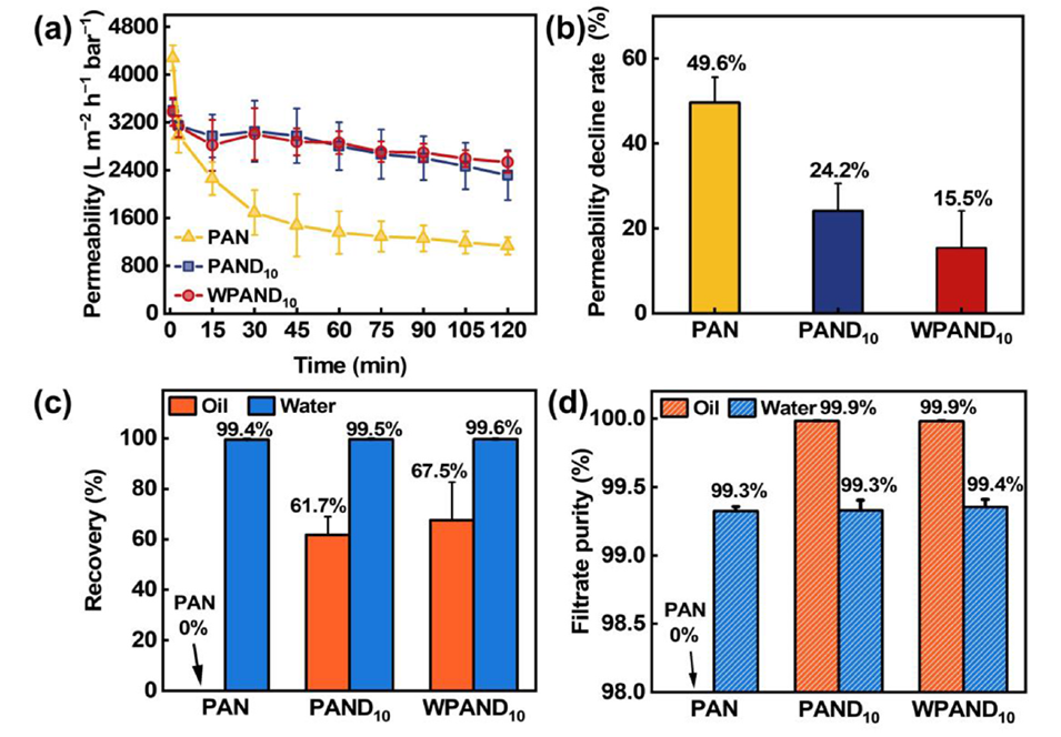 图 4. (a) 由 PAN、PAND 10 和 WPAND 10 膜分离 D5 水包油乳液后的渗透率,(b) 渗透率下降率,(c) 油和水的回收率,以及 (d) 滤液(油相和水相)的纯度。