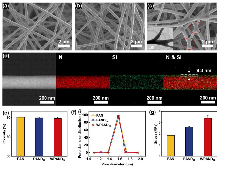 图 2. (a)PAN、(b)PAND 10 和(e)WPAND 10 膜的扫描电子显微镜(SEM)图像。插图为 WPAND 纳米纤维的透射电子显微镜(TEM)图像。(d)PAND 10 纳米纤维的 TEM 图像及其氮、硅元素和氮硅复合元素的映射图。(e)PAN、PAND 10 和 WPAND 10 膜的孔隙率、(f)孔径分布及(g)拉伸应力。