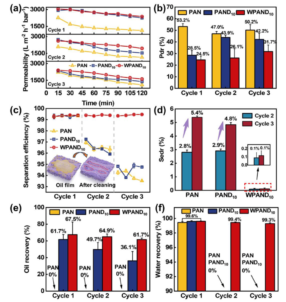 图 6. 在针对 SLS 稳定的 D5 水包油乳液的循环过滤研究中,PAN、PAND 10 和 WPAND 10 膜的实时 (a-d) 水渗透率、分离效率及下降率,以及 (e) 油和 (f) 水回收率的变化。