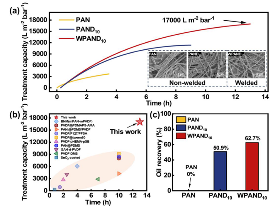 图 5. (a) PAN、PAND 10 和 WPAND 10 膜在长期过滤 SLS 稳定的 D5 水包油乳液过程中的乳液处理能力。(b) 不同研究中连续分离过程中乳液处理能力的对比。(c) PAN、PAND 10 和 WPAND 10 膜在长期过滤 SLS 稳定的 D5 水包油乳液过程中的滤液回收率。