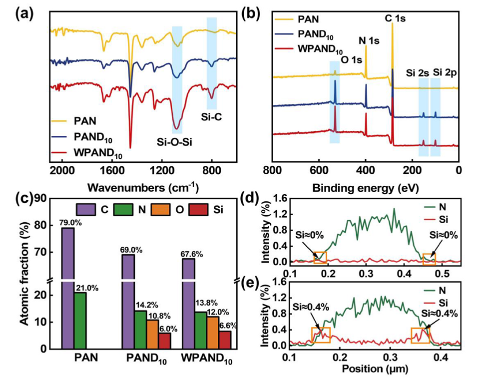 图3. (a) PAN、PAND 10 和 WPAND 10 膜的衰减全反射傅里叶变换红外光谱(ATR-FTIR)和 (b) X 射线光电子能谱(XPS)。(c) 通过 XPS 计算得到的相应膜的原子分数。(d) PAN和(e) PAND10 纳米纤维沿单根纤维横截面的氮和硅元素分布。