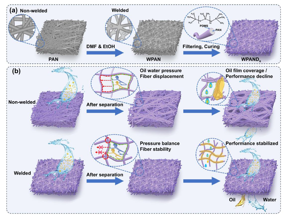 图 1. (a) WPAND 膜制备过程的示意图。(b) 油水乳液分离中焊接与非焊接结构的变化示意图。