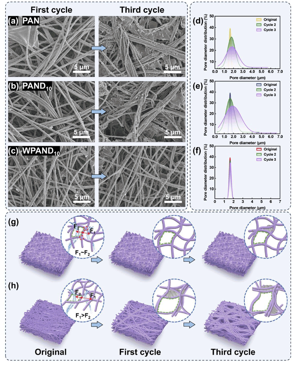 图 7. (a)PAN、(b)PAND 10 和(c)WPAND 10 膜在一个循环和三个循环后的扫描电子显微镜(SEM)图像。(d)PAN、(e)PAND 10 和(f)WPAND 10 膜在不同循环后的统计孔径分布。(g)焊接结构和(h)非焊接结构膜在三个循环内水合压力和表面活性剂污染物变化的示意图。