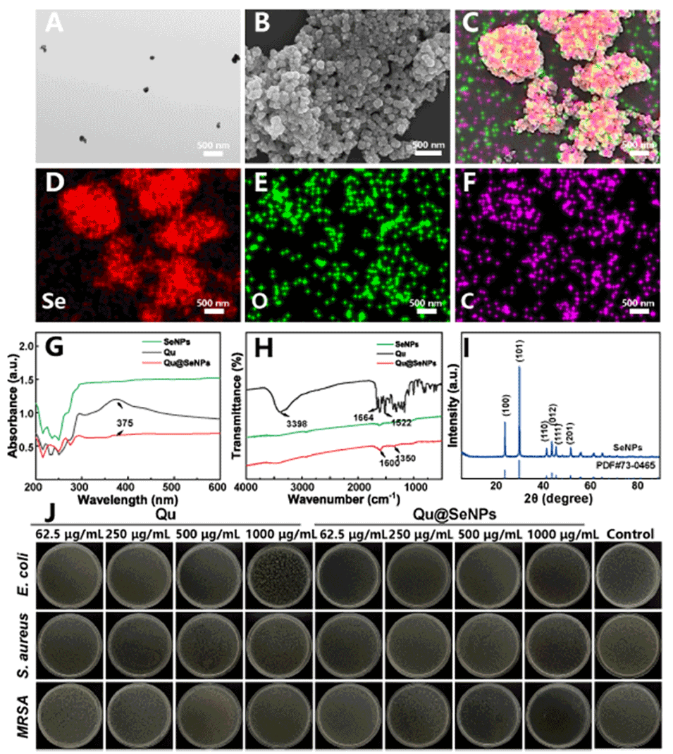 图2. Qu@SeNPs的TEM和SEM图像(A, B);Qu@SeNPs的元素图(C-F)、紫外可见光谱(G)、红外光谱(H);SeNPs的XRD谱(I),不同浓度下Qu和Qu@SeNPs的抑菌试验(J)。