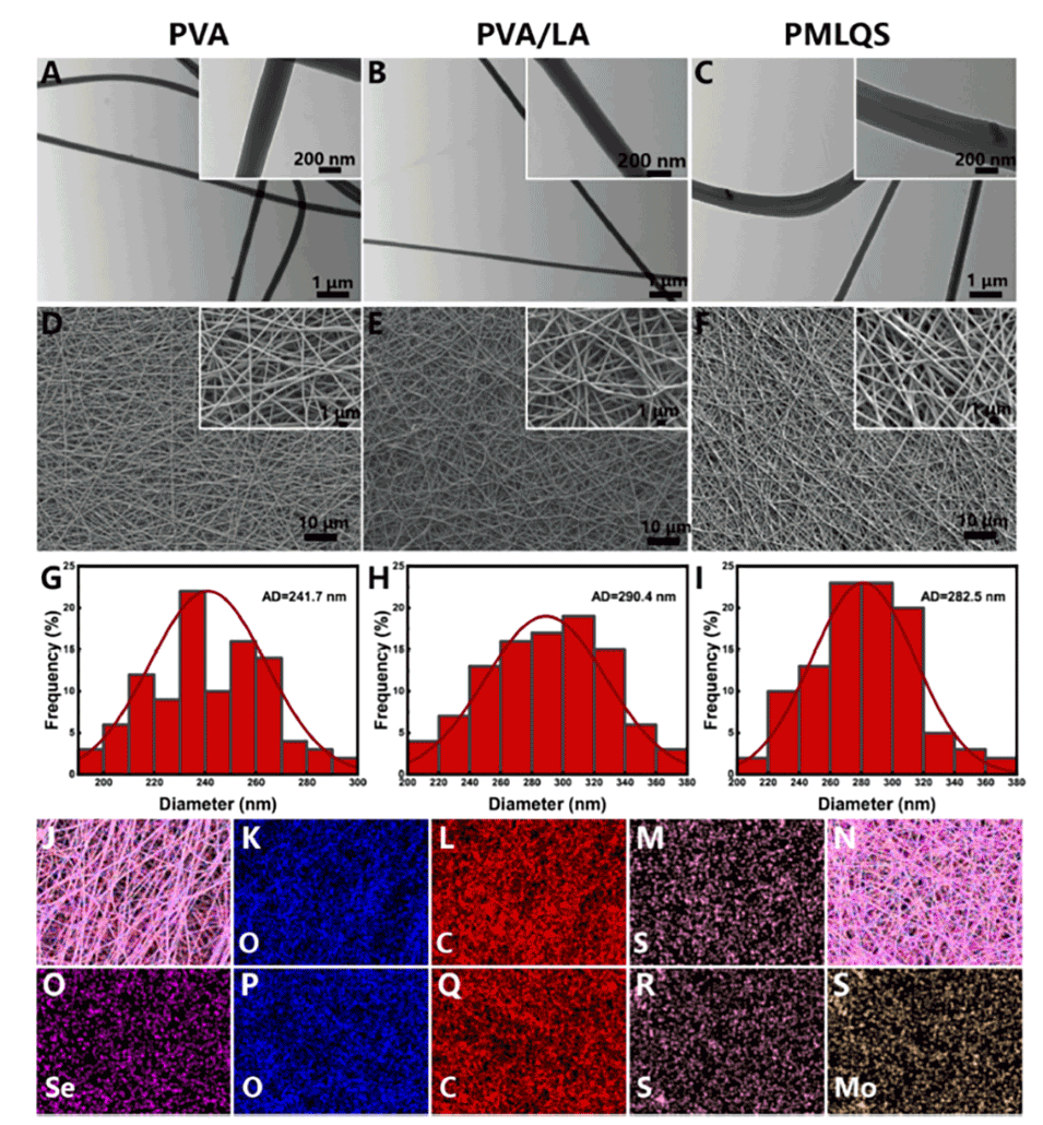 图 4. 所制备纳米纤维膜的透射电镜(TEM)图像:聚乙烯醇(PVA)(A)、聚乙烯醇/硫辛酸(PVA/LA)(B)和聚乙烯醇/二硫化钼/硫辛酸/槲皮素稳定硒纳米颗粒(PMLQS)(C)。所制备纳米纤维膜的扫描电镜(SEM)图像及直径分布:聚乙烯醇(PVA)(D、G)、聚乙烯醇/硫辛酸(PVA/LA)(E、H)和聚乙烯醇/二硫化钼/硫辛酸/槲皮素稳定硒纳米颗粒(PMLQS)(F、I)(比例尺:1 μm,放大倍数:1000 倍)。所制备纳米纤维膜的能量色散光谱(EDS)元素分布图:聚乙烯醇/硫辛酸(PVA/LA)(J-M)、聚乙烯醇/二硫化钼/硫辛酸/槲皮素稳定硒纳米颗粒(PMLQS)(N-S)。