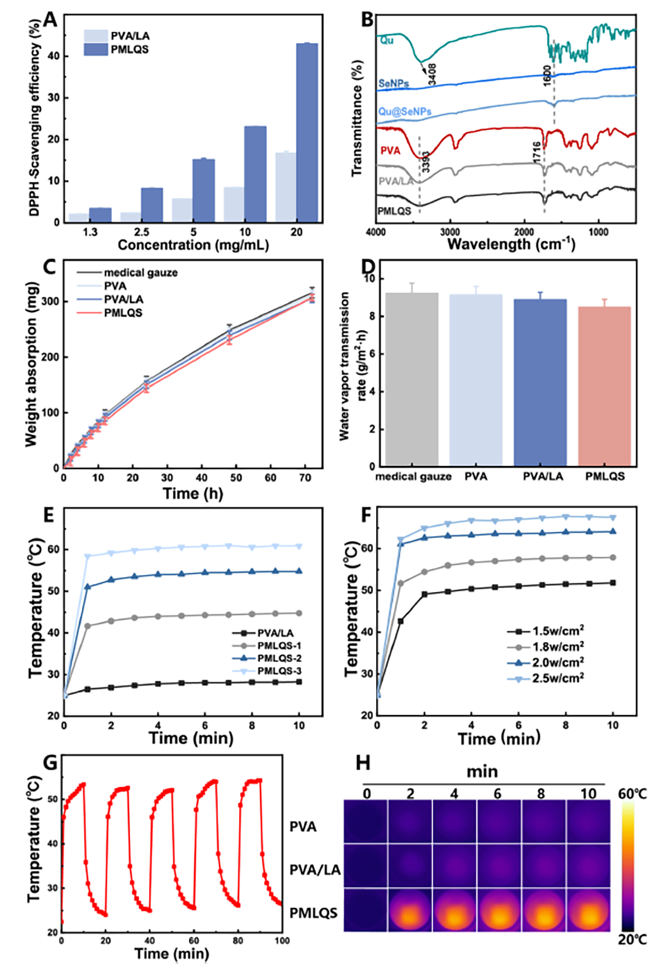 图 5. 聚乙烯醇(PVA)、聚乙烯醇/硫辛酸(PVA/LA)、聚乙烯醇/ 二硫化钼/硫辛酸/槲皮素稳定硒纳米颗粒(PMLQS)在 2 小时内的 DPPH 自由基清除效率(A)。槲皮素(Qu)、硒纳米颗粒(SeNPs)、槲皮素稳定硒纳米颗粒(Qu@SeNPs)及电纺纳米纤维膜(ENMs)的傅里叶变换红外光谱(FT-IR)(B)。电纺纳米纤维膜在 72 小时内的重量吸收曲线(C)和水蒸气透过率(WVTR)(D)。不同浓度下电纺纳米纤维膜的光热效应(功率密度:2.0 W/cm²)(E)及不同功率下的光热效应(F)。聚乙烯醇/二硫化钼/硫辛酸/槲皮素稳定硒纳米颗粒(PMLQS)电纺纳米纤维膜的光热转换循环测试(G)。近红外光照射下膜的光热图像(H)。