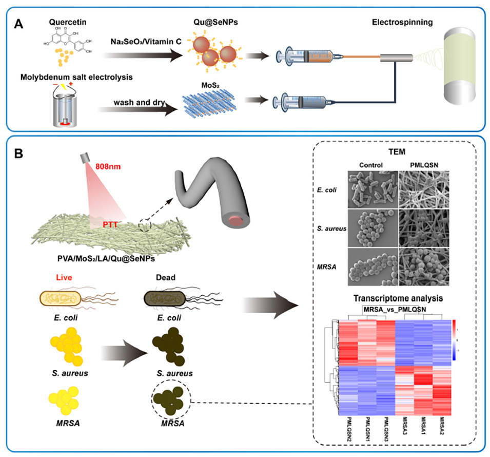 1、该研究制备了一种同轴电纺纳米纤维膜(PMLQS ENMs),其由槲皮素稳定的硒纳米颗粒(Qu@SeNPs)和电合成的二硫化钼(MoS₂)纳米片通过同轴电纺技术制成,具有近红外光响应特性,可对抗耐药菌。