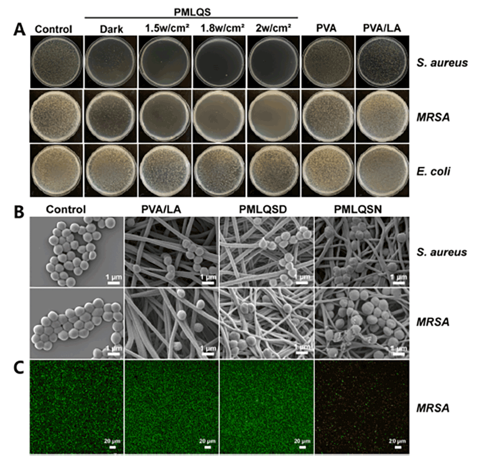 图 6. 聚乙烯醇(PVA)、聚乙烯醇/硫辛酸(PVA/LA)、聚乙烯醇/二硫化钼/硫辛酸/槲皮素稳定硒纳米颗粒(PMLQS)在有无近红外光(NIR)照射下的抗菌结果(A)。金黄色葡萄球菌(S. aureus)和耐甲氧西林金黄色葡萄球菌(MRSA)的对照组及经聚乙烯醇/硫辛酸(PVA/LA)和聚乙烯醇/二硫化钼/硫辛酸/槲皮素稳定硒纳米颗粒(PMLQS)纳米纤维膜在有无近红外光照射(功率密度:2.0 W/cm²,时间:10 分钟)处理后的扫描电镜(SEM)图像(B)。耐甲氧西林金黄色葡萄球菌(MRSA)的对照组及与聚乙烯醇/硫辛酸(PVA/LA)和聚乙烯醇/二硫化钼/硫辛酸/槲皮素稳定硒纳米颗粒(PMLQS)纳米纤维膜在有无近红外光照射接触后的共聚焦激光扫描显微镜(CLSM)图像。所有样品在观察前均用钙黄绿素 - AM(绿色)和碘化丙啶(红色)染色 60 分钟。