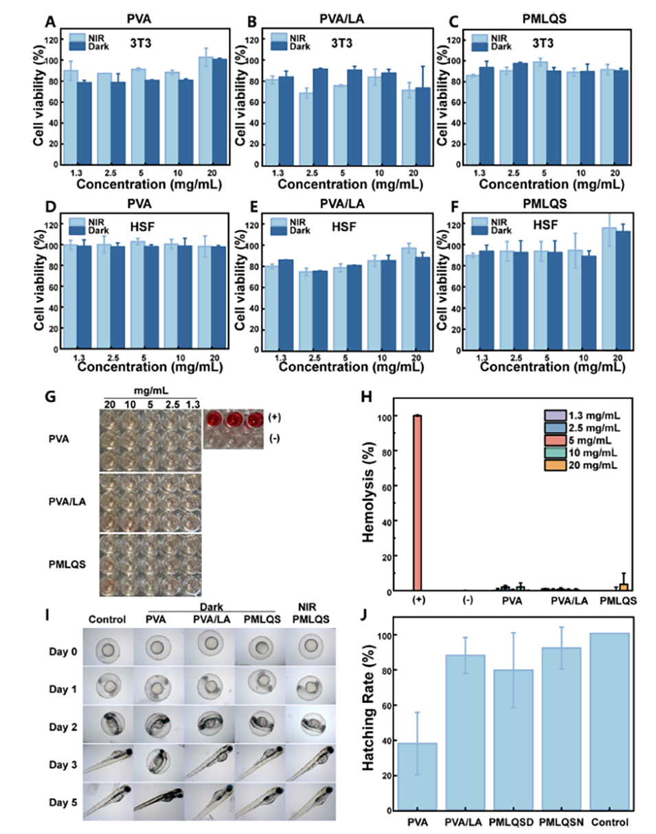 图 7. 3T3-L1 细胞(A-C)和人皮肤成纤维细胞(HSF)(D-F)在暴露于聚乙烯醇(PVA)、聚乙烯醇/硫辛酸(PVA/LA)和聚乙烯醇/二硫化钼/硫辛酸/槲皮素稳定硒纳米颗粒(PMLQS)纳米纤维膜浸出液(有无近红外光照射)24 小时后的细胞毒性。2 小时红细胞溶血试验的图像和结果(G-H)。斑马鱼卵在 5 天内经聚乙烯醇(PVA)、聚乙烯醇/硫辛酸(PVA/LA)和聚乙烯醇/二硫化钼/硫辛酸/槲皮素稳定硒纳米颗粒(PMLQS)(有无近红外光照射)处理后的图像(I)以及 3 天内的孵化率(J)(功率密度:2.0 W/cm²)。