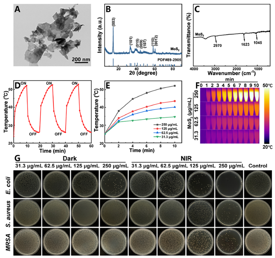 图 3. 二硫化钼(MoS₂)的透射电镜(TEM)图像(A)、X 射线衍射(XRD)图谱(B)、傅里叶变换红外光谱(FTIR)(C)。不同浓度下二硫化钼(MoS₂)的光热转换循环测试(D)、光热效应(E)和光热图像(F)(功率密度:2.0 W/cm²)。近红外光(NIR)照射和黑暗条件下二硫化钼(MoS₂)的抗菌结果(功率密度:2.0 W/cm²)(G)。