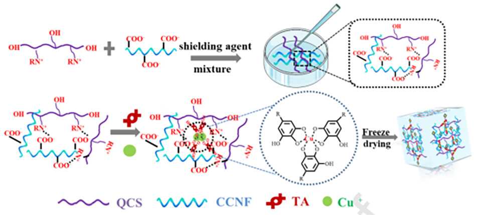图1.止血海绵CQTC的制备方法示意图。TA=鞣酸;QCS=季铵化壳聚糖;CCNF=羧基化纤维素纳米纤维。