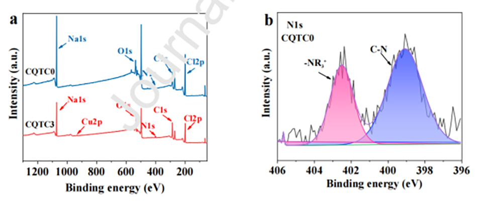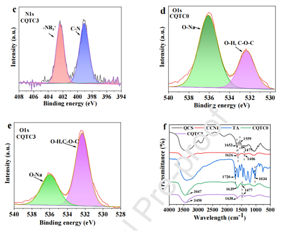 图3.(a)CQTC0和CQTC3的XPS全谱。(b)CQTC0和(c)CQTC3的N1s。(d)CQTC0和(e)CQTC3的O1s。(f)FTIR光谱。