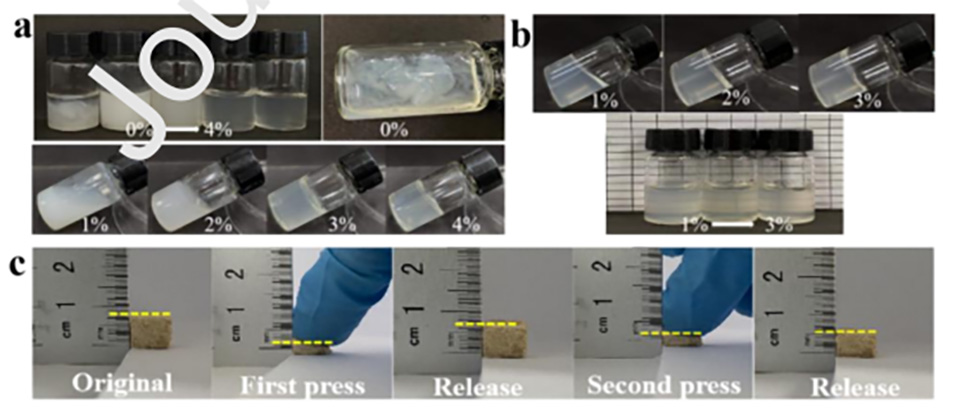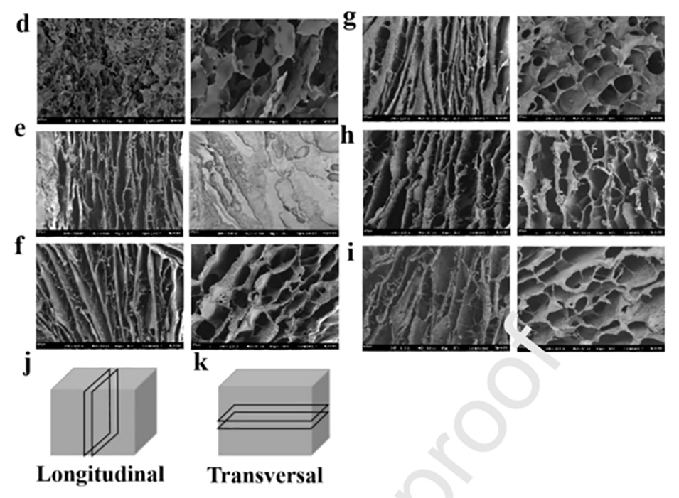 图2.(a)不同NaCl浓度和(b)不同QCS浓度下CCNF和QCS混合物的图像。(c)压缩循环中的CQTC海绵。(d)QCS、(e)CQTC0、(f)CQTC1.5、(g)CQTC3、(h)CQTC5和(i)CQTC10的SEM光谱。(j)纵向和(k)横向海绵截面的示意图。