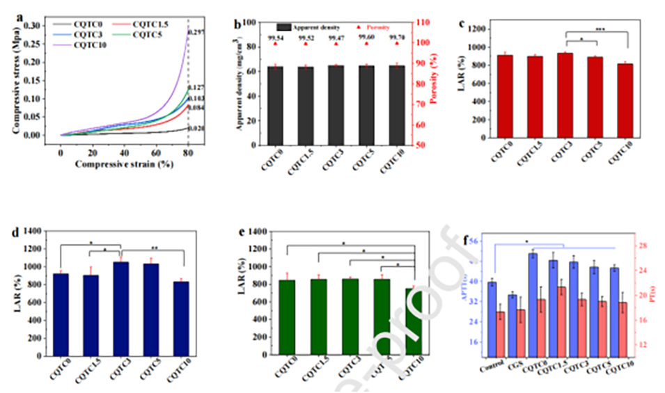 图4.(a)压缩应力-应变曲线。(b)表观密度和孔隙度。(c-e)海绵对DI、PBS和SBFs的液体吸收比(*p<0.05,**p<0.01和***p<0.001)。LAR:液体吸收比;(f)CQTC性能,包括显示凝血时间的APTT和PT测定。