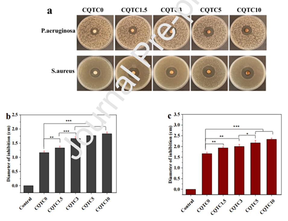 图5.CQTC的抑菌作用。(a)铜绿假单胞菌和金黄色葡萄球菌在含有CQTC的TSA上生长;不同CQTC组对(b)铜绿假单胞菌和(c)金黄色葡萄球菌的抑菌圈直径。(*p<0.05,**p<0.01,***p<0.001)。