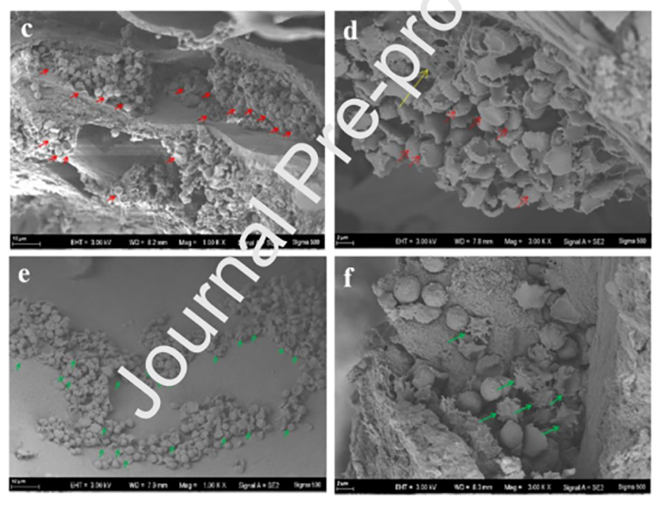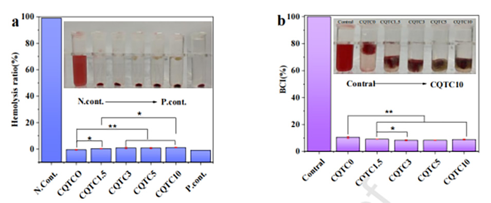 图7.血液与CQTC的相互作用。(a)CQTC溶血率。(b)CQTC的BCI(p<0.05,**p<0.01,**p<0.001)。CQTC3与红细胞(c,d)和血小板(e,f)相互作用的SEM图像。N.cont=阴性对照;P.cont=阳性对照。