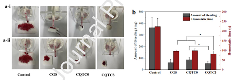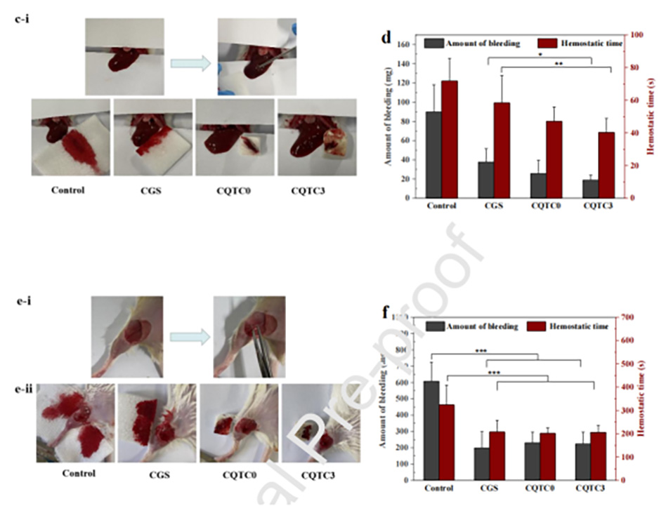 图8.(a)尾静脉、(c)肝撕裂和(e)股动脉出血模型的建立和止血过程图像(i建立出血模型;ii止血过程)。(b)尾静脉、(d)肝撕裂和(f)股动脉出血模型的出血量和止血时间(*p<0.05,**p<0.01,***p<0.001)。