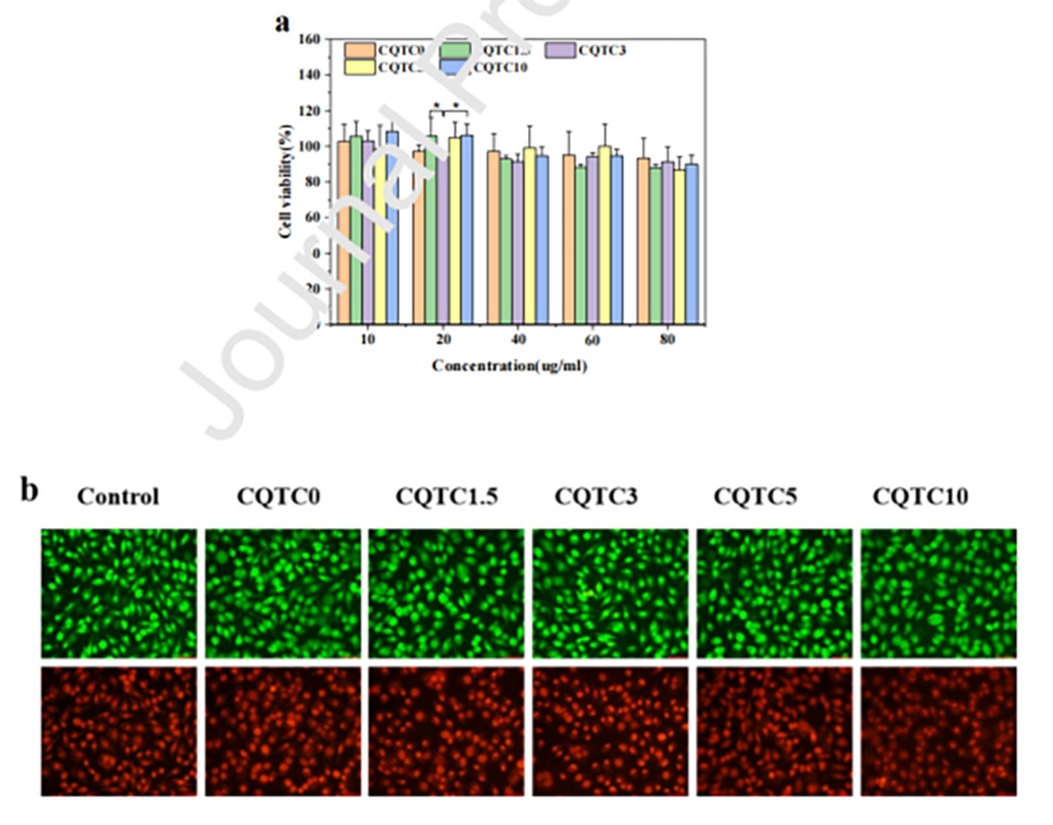 图6.CQTC的生物相容性。(a)与CQTC提取物共孵育的L929细胞的存活率。(b)L929细胞与80µg/mL CQTC提取物共孵育的荧光图像(*p<0.05)。活细胞显示绿色荧光,死细胞显示红色荧光。