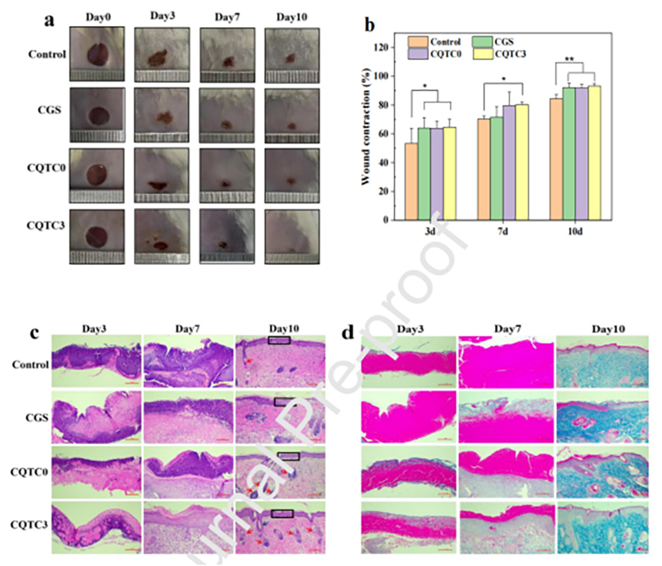 图10.CQTC的伤口愈合。(a)小鼠皮肤伤口治疗第0、3、7和10天,对照组、CGS(市售止血海绵)、CQTC0和CQTC3的图像及(b)伤口收缩率(*p<0.05,**p<0.01,***p<0.001表示存在统计学显著性)。(c)H&E染色,表皮(黑色方框)、毛囊(红色箭头)和汗腺(蓝色箭头)。(d)愈合过程中的Masson染色。