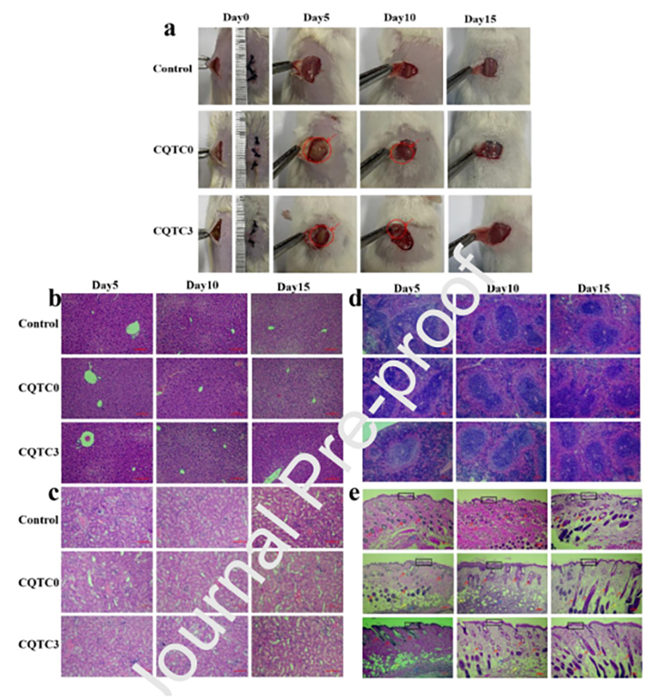 图9.CQTC的组织相容性。(a)皮下植入不同时间的海绵状态图像。植入部位的H&E染色:(b)肝脏、(c)肾脏、(d)脾脏和(e)皮肤。