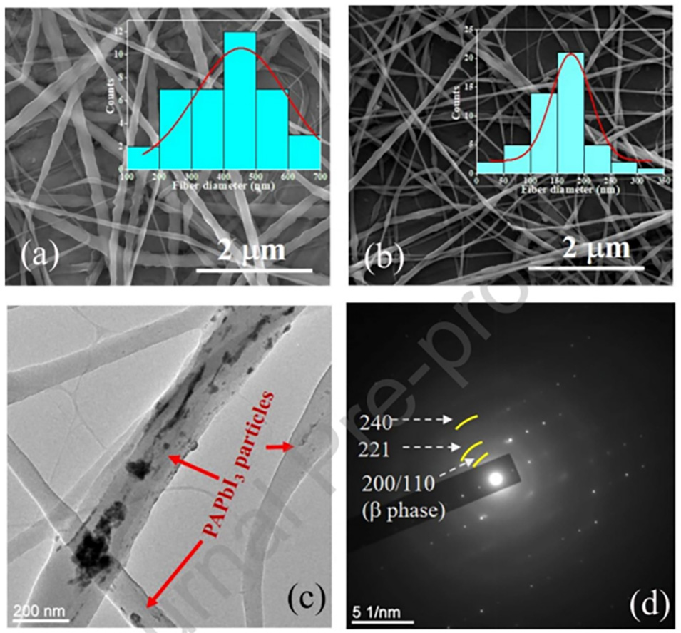 图2.(a)-(b)PVNF和PANF(4.76)的FESEM图像。PVNF和PANF(4.76)的纤维直径分布如图(a)-(b)的插图所示。(c)-(d)PANF(4.76)的TEM图像和SAED图案。