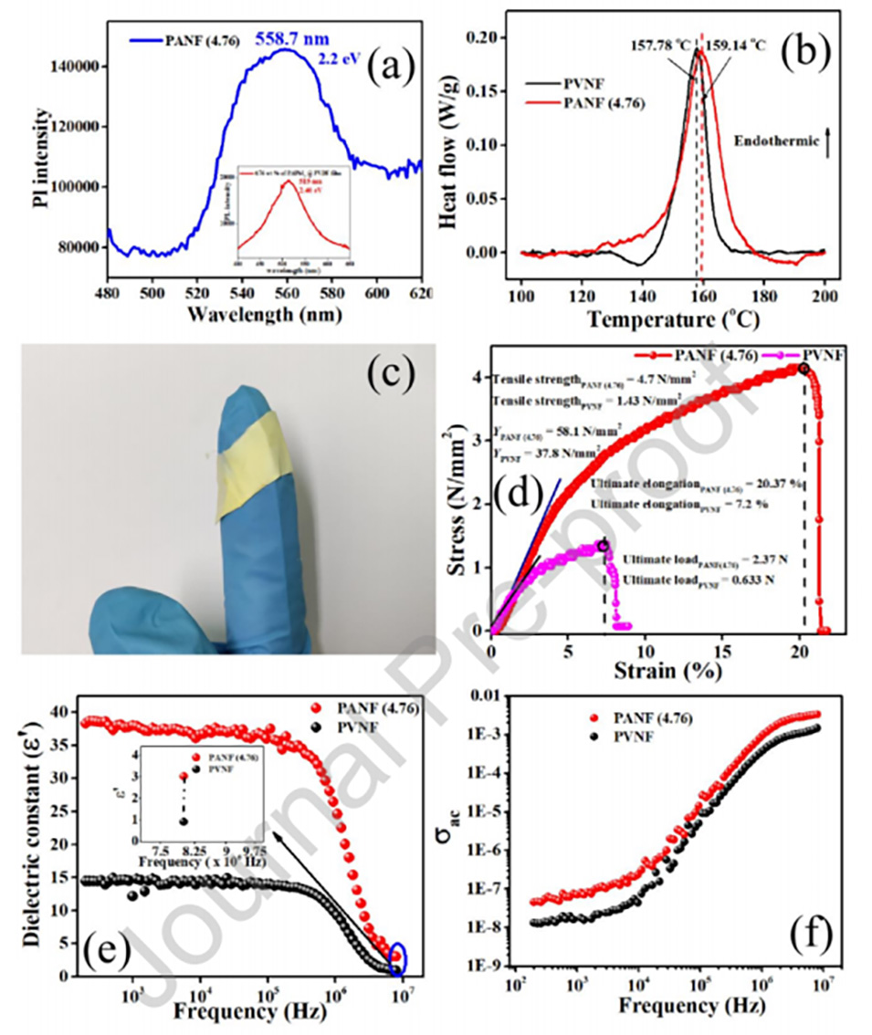 图3.(a)PANF(4.76)的PL光谱。(a)的插图表示4.76wt%的PAPbI3@PVDF薄膜的PL光谱。(b)PVNF和PANF(4.76)的DSC热成像。(c)通过将PANF(4.76)包裹在手指上展示了其超柔性。(d)电纺PVNF和PANF的应力-应变曲线(4.76)。(e)-(f)PVNF和PANF(4.76)的介电性能和电导率研究。(e)的插图显示了高频区域的εr变化。