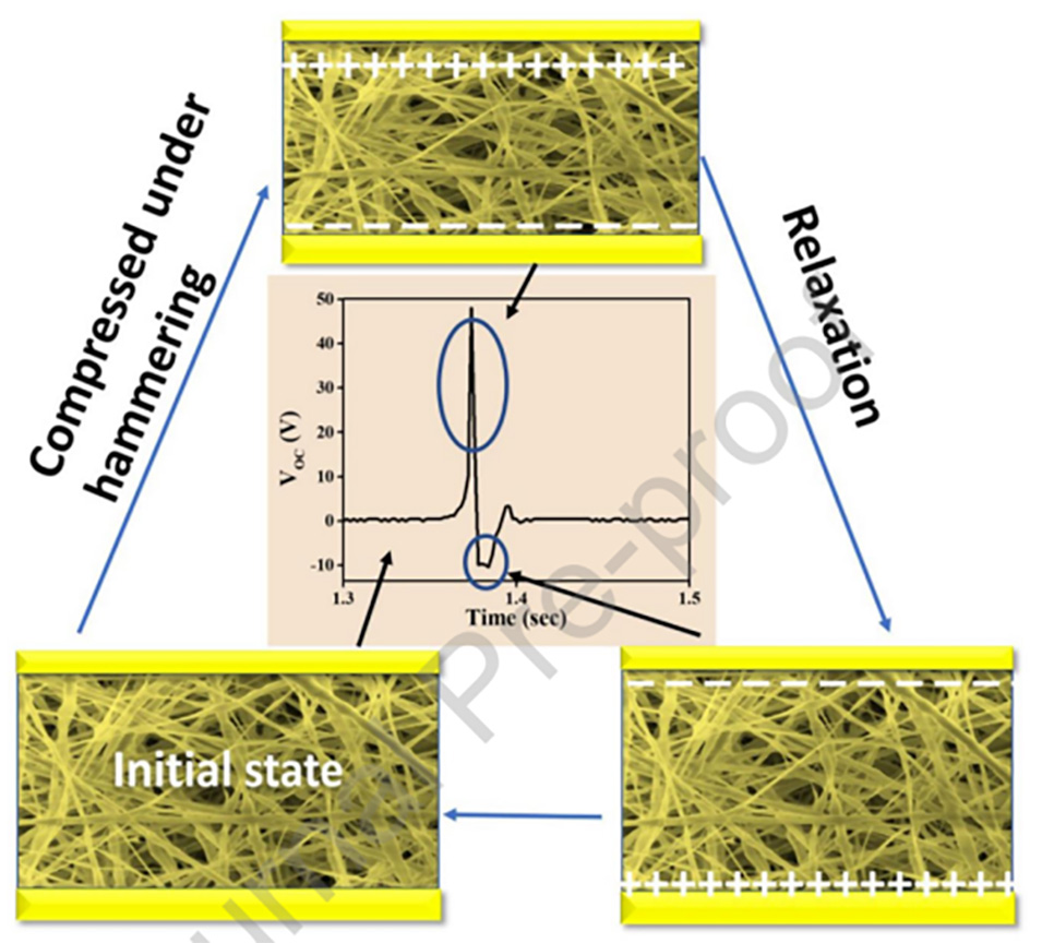 采用溶胶-凝胶法合成了丙胺铅碘C3H7NH3PbI3,并将其加入聚偏氟乙烯(PVDF)中,通过静电纺丝技术制备出纳米纤维。这些纳米纤维具有增强的结晶度,非极性相成功转化为极性相含量。C3H7NH3PbI3的加入也显著提高了纳米纤维的拉伸强度和热稳定性。观察到制造的轻质、柔性、耐用、成本效益高的自供电压电纳米发电机在徒手周期性锤击下产生了60V的开路电压、27.5μA的短路电流和9.81mW/m2的功率。还检测到这种纳米发电机能够清除各种来源机械能的电压生成。该装置具有卓越的机械灵敏度(低作用力区约为6.3V/N,高作用力区为12.12V/N),能量转换效率约42.03%。发电机的柔性和超灵敏度赋予了其作为可穿戴纳米传感器的实用性。此外,纳米发电机的超快电容充电能力确保了其作为纳米触觉传感器的潜力。C3H7NH3PbI3@PVDF复合材料的最佳能带隙和光活性性质证实了其作为光电探测器/二极管的功效。因此,利用这种C3H7NH3PbI3@PVDF复合材料能够设计出一款单独/同时作为机械能和太阳能收集器的多功能装置。