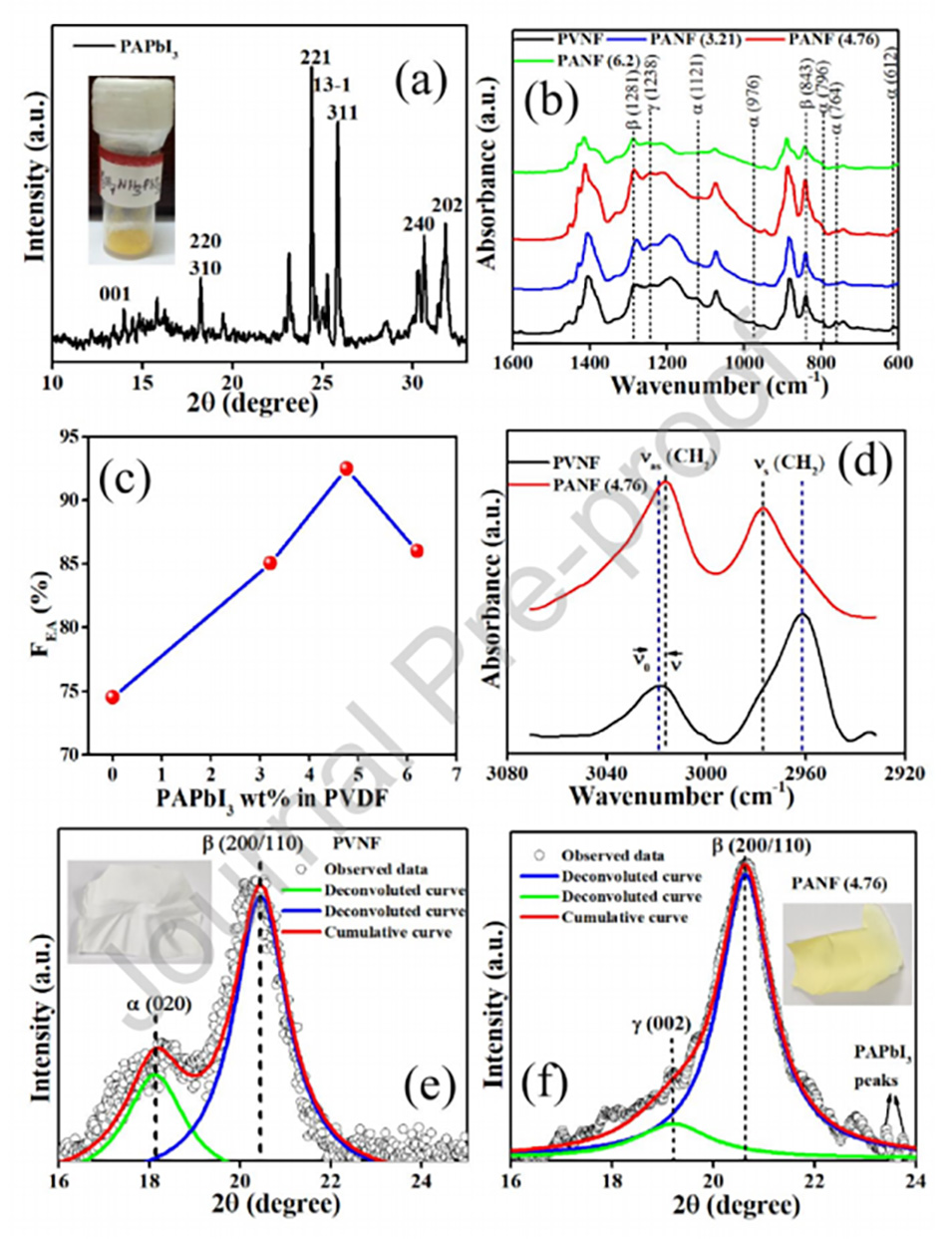 图1.(a)溶胶-凝胶合成PAPbI3的XRD图谱。(a)的插图是PAPbI3的相应数字照片。(b)含不同重量百分比PAPbI3的PVNF和PANF在1600-600cm-1范围内的FTIR光谱。(c)PVDF中电活性相含量随PAPbI3重量百分比的变化。(d)PVNF和PANF(4.76)在3080-2920cm-1范围内的FTIR光谱。(e)-(f)PVNF和PANF(4.76)的去卷积XRD曲线。(e)和(f)的插图分别为PVNF和PANF(4.76)的数码照片。