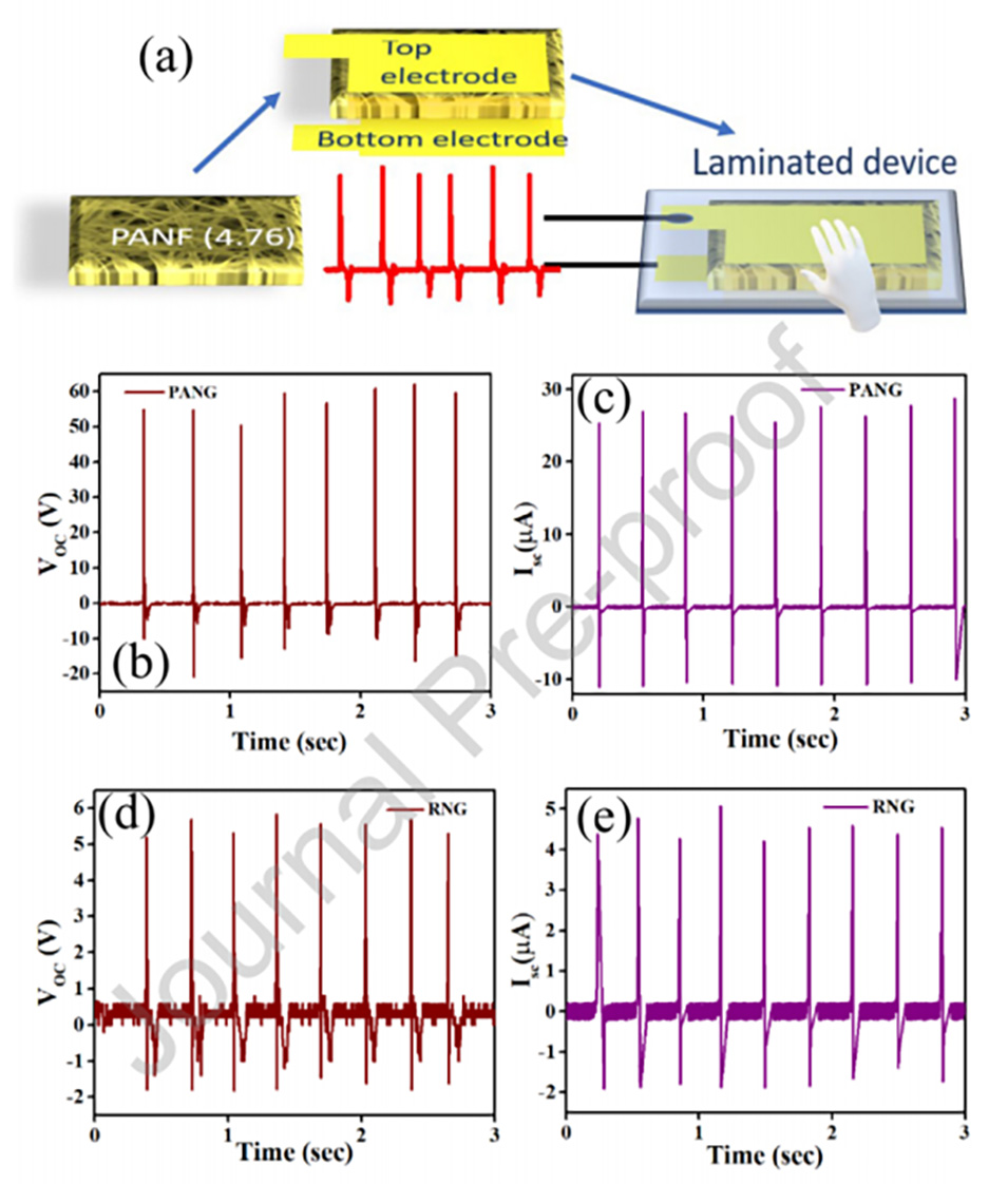 图4.(a)设备制造示意图。(b)-(e)PANG和RNG的开路电压和短路电流的变化,及其与徒手锤击时间的函数关系。