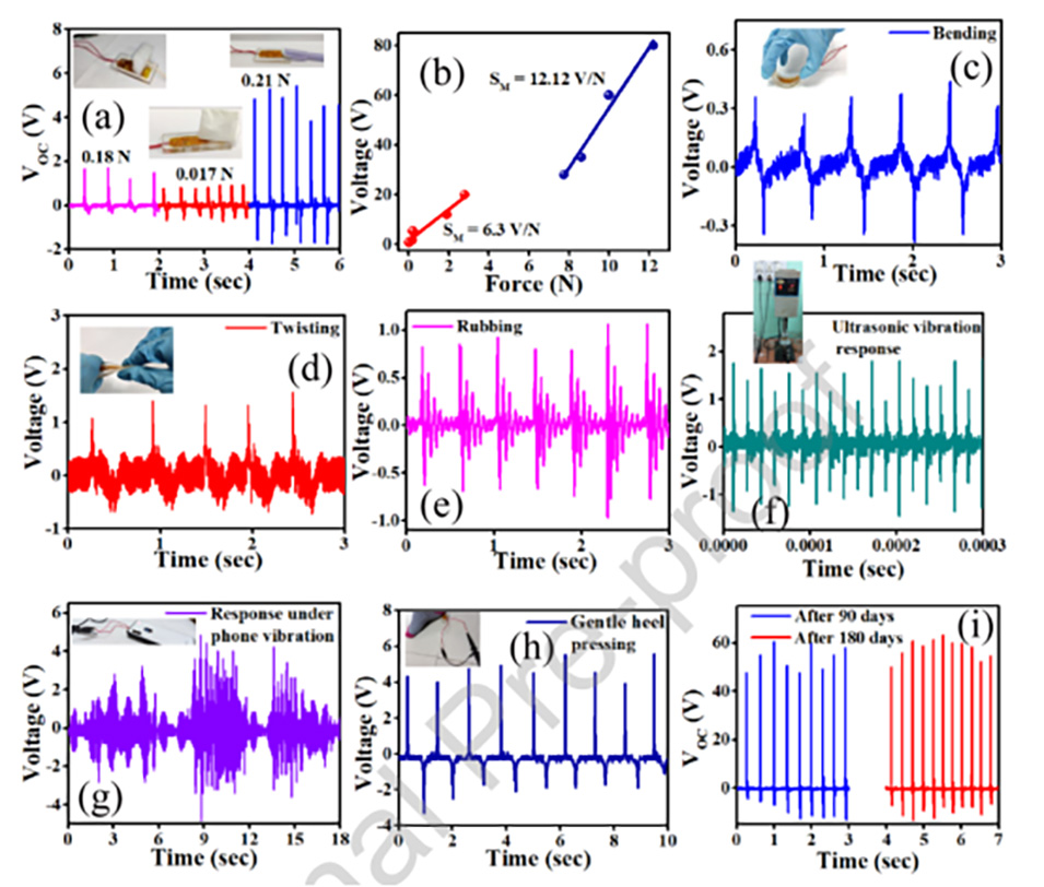 图6.(a)不同作用力下的电压响应图。(a)的插图是该设备在各种作用力下的数码照片。(b)PANG的机械敏感性。(c)-(e)弯曲、扭曲和摩擦PANG时,电压响应随时间的变化。(f)-(g)PANG在超声波振动和电话振动下的灵敏度。超声波振动的数码照片如(f)的插图所示。(h)PANG在脚跟轻压下的电压响应。相应的数码照片显示在各图的插图中。(i)设备制造3个月和6个月后,用手敲击时PANG的反应。