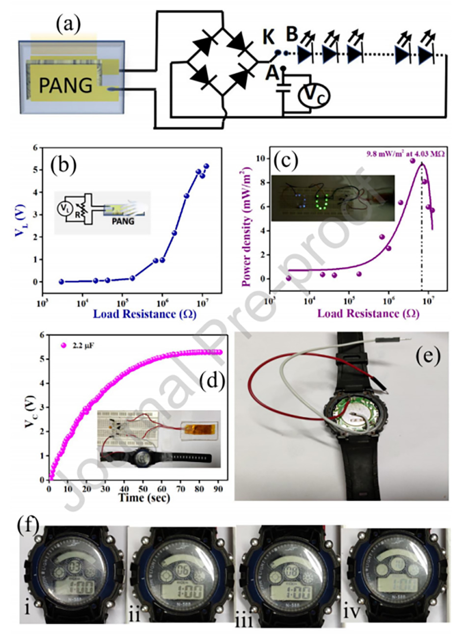 图7.(a)用于点亮LEDs以及为电容器充电的桥式整流器电路设计。(b)-(c)各负载电阻的输出负载电压和输出功率密度图。(b)和(c)的插图为具有不同负载电阻的PANG的电路示意图,发光LEDs显示“JU”。(d)电容器响应与时间的函数关系。(e)-(f)用充电电容器为手表供电。