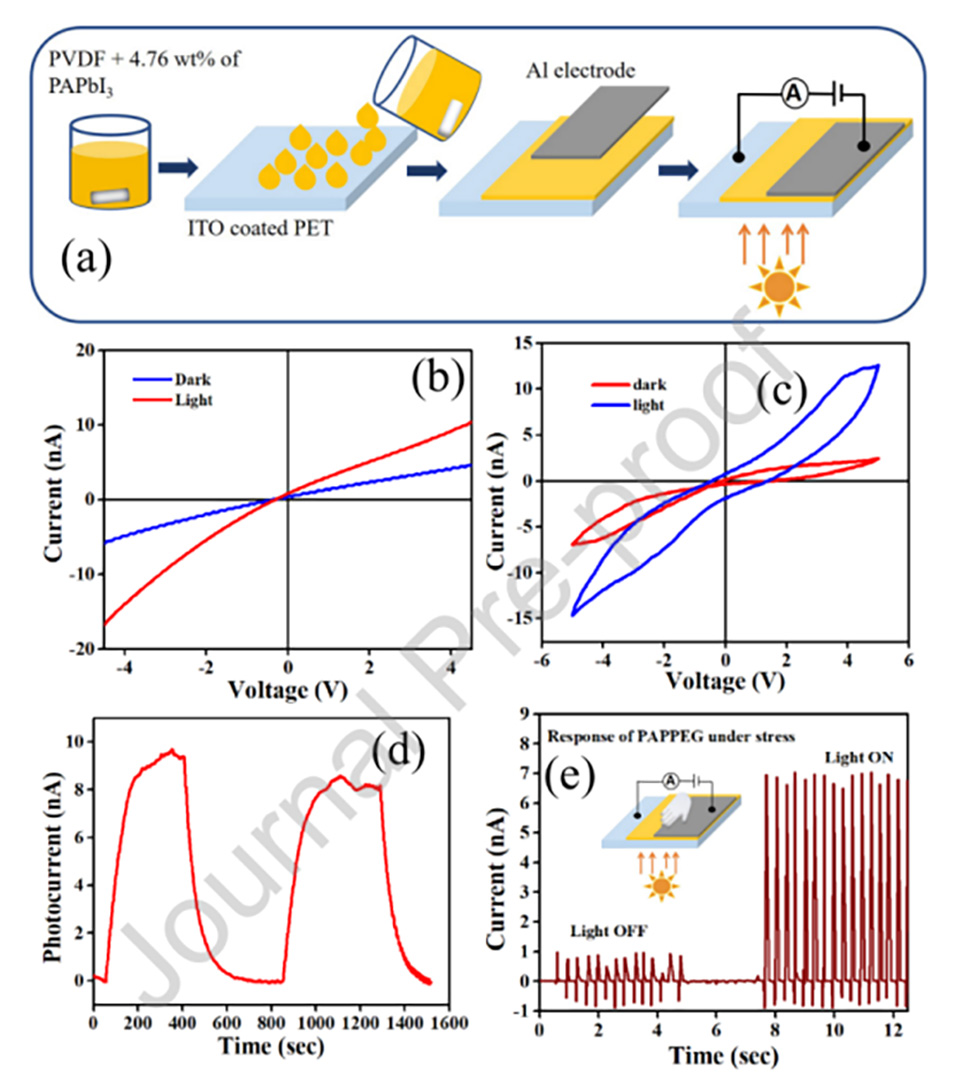 图8.(a)PAPPEG的分步制备工艺。在PAPPEG中,(b)黑暗和照明条件下电流随电压的变化,(c)黑暗和照明条件下的I-V滞后回线,(d)光电流响应随时间的变化,(e)施加应力时,黑暗和照明条件下的电流响应,插图显示了相应的示意图。