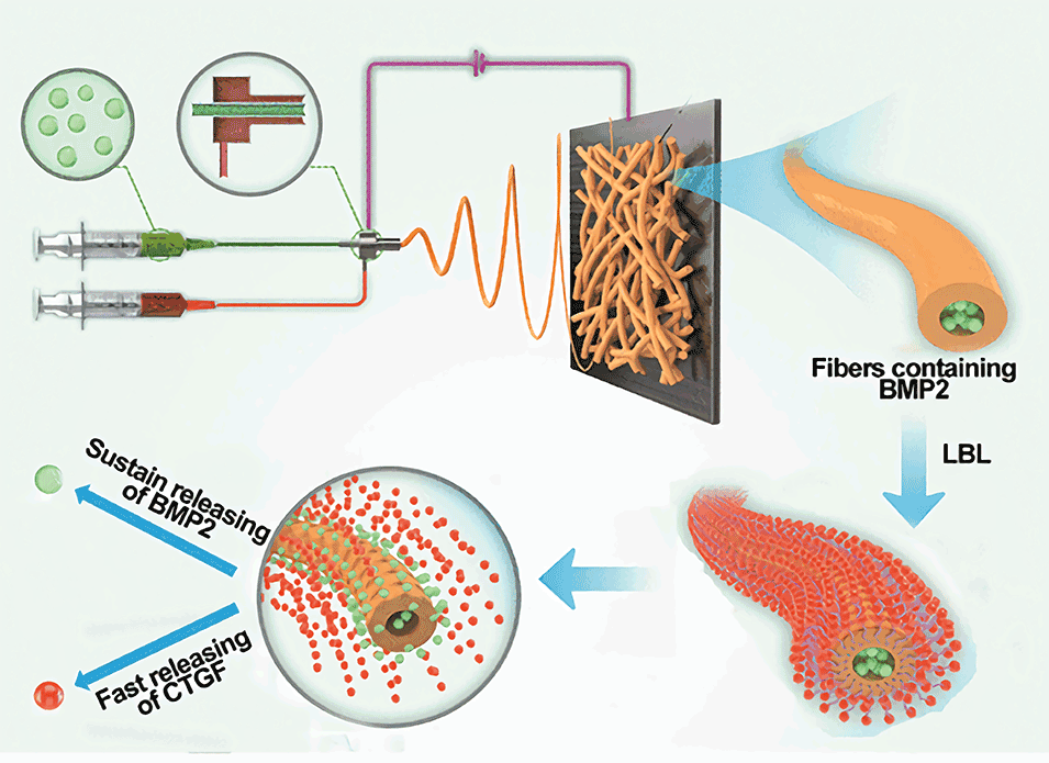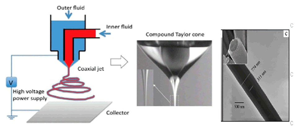 同轴静电纺丝技术就是用同轴复合喷嘴来代替单一喷嘴制备核壳结构纳米纤维,用于对药物的控释,已发展为比较成熟的技术。通过该技术制备的核壳结构纳米纤维中,核用于固定药物,而壳用来控制药物向纤维外的扩散。药物释放随时间的线性关系以及持续释放时间均会受到核壳结构的影响。