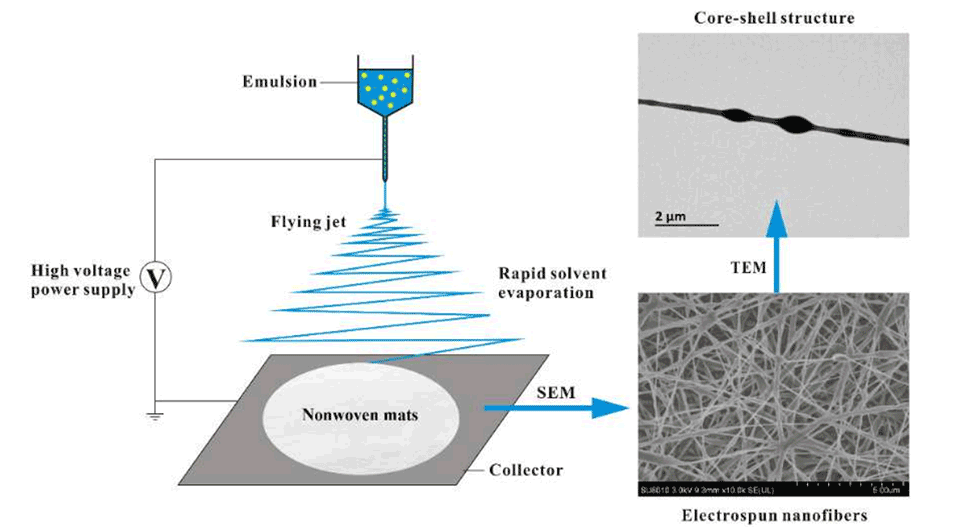 对于水溶性的加载药物,研究者更倾向于采用乳液静电纺丝法将其包覆于纳米纤维中。
