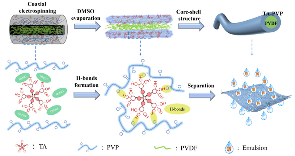 研究者以聚偏氟乙烯(PVDF)为增强芯材,采用一步同轴静电纺丝设计了超分子纳米纤维水凝胶膜。二甲基亚砜(DMSO)调控单宁酸(TA)与聚乙烯吡咯烷酮(PVP)之间的氢键交联。随着 DMSO 的挥发,PVP 和 TA 之间形成了水不溶性超分子壳,紧紧包裹在 PVDF 核周围。纤维水凝胶膜具有稳定的超润湿性和空间连通性,对各种水包油乳液甚至强酸性油水乳液具有较高分离性能。SDS稳定的酸性油水乳状液分离渗透率可达22293 L m−2 h−1 bar−1,连续分离3 h后仍保持在17834 L m−2 h−1 bar−1左右。