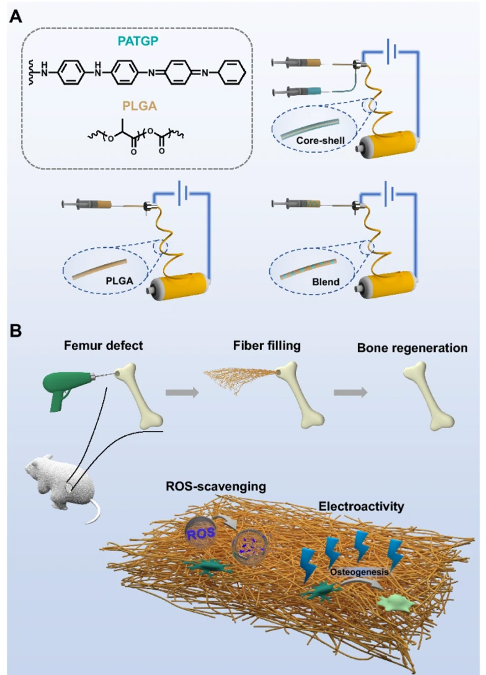 研究者基于静电纺丝技术,分别制备了单组分的聚酯纤维(PLGA)、以及PLGA和PATGP组成的共混纤维(Blend)及核壳纤维(Core-shell)支架。在Core-shell中,PLGA为核层、PATGP为壳层。电活性聚膦腈基静电纺丝纳米纤维支架具有较好的清除ROS功能,可有效抑制骨缺损过程中的炎症反应。在动物实验中,验证了聚膦腈基纳米纤维良好的骨组织修复效果。