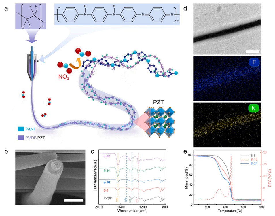 研究者通过同轴静电纺丝构建了核-壳结构智能纺织品(CST),在单根纤维中耦合了聚偏二氟乙烯/锆钛酸铅(PVDF/PZT)芯层的压电换能与聚苯胺/聚乙烯吡咯烷酮(PANI/PVP)壳层的化学电阻传感特性(图1)。气体类型和浓度的化学特定信息被加载到压电传感器的输出信号中,无需电源并能够自主同步监测 NO2气体的压力和浓度。这为自主的多功能环境监测提供了新方案,并为能量转换界面的信息获取理论模型建立提供了支持。