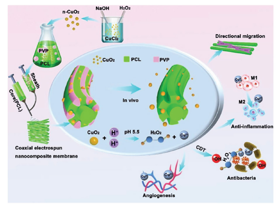 主要内容:该研究通过同轴静电纺丝制备了具有独特的“核/鞘”结构的纤维膜,其壳层由纳米过氧化铜(CuO2)、聚乙烯吡咯烷酮(PVP)和聚己内酯(PCL)组成,核层则由PCL组成。当暴露在创面潮湿内环境时,核层内PVP逐渐分解释放嵌入的纳米CuO2。从而在糖尿病及细菌感染等弱酸性创面微环境的诱导下,通过化学动力学反应释放H2O2和Cu2+离子,随后引发类芬顿反应产生·OH以抗菌,铜离子释放随后抑制炎症,并促进血管生成。同时,PVP的溶解在纳米纤维上形成了独特的纳米沟槽表面图案,为加速皮肤再生提供了所需的细胞引导功能。