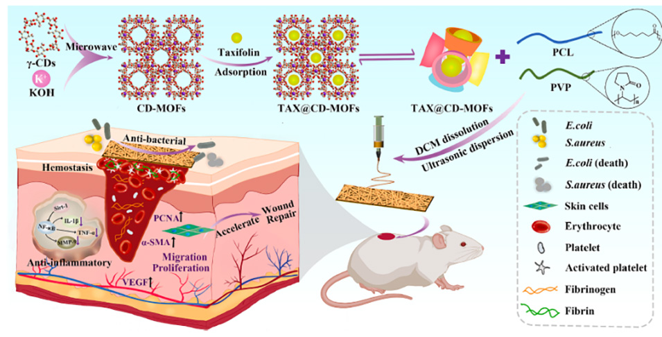 主要内容:将Taxifolin (TAX)负载到环糊精金属有机框架(CD-MOFs)上,然后通过静电纺丝将其负载到聚己内酯(PCL)支架上,构建具有抗菌、抗炎、止血和伤口渗出物吸收性能的多功能电纺丝纤维膜(EFMs)。所得的 EFM 具有亲水表面,有利于伤口粘附并增强其止血性能。通过聚集创面渗出液,触发TAX的级联释放,减少创面细菌感染,降低炎症因子的表达。这也促进了胶原沉积、血管再生和肌成纤维细胞的收缩和迁移,促进了伤口组织的重塑和修复。