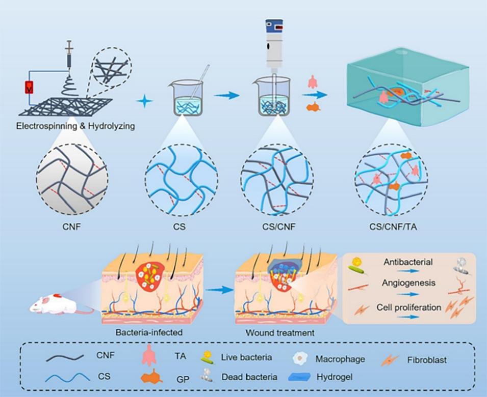 4、Carbohydrate Polymers:纤维素纳米纤维嵌入壳聚糖/单宁水凝胶具有高抗菌活性和止血能力,用于耐药细菌感染伤口的愈合