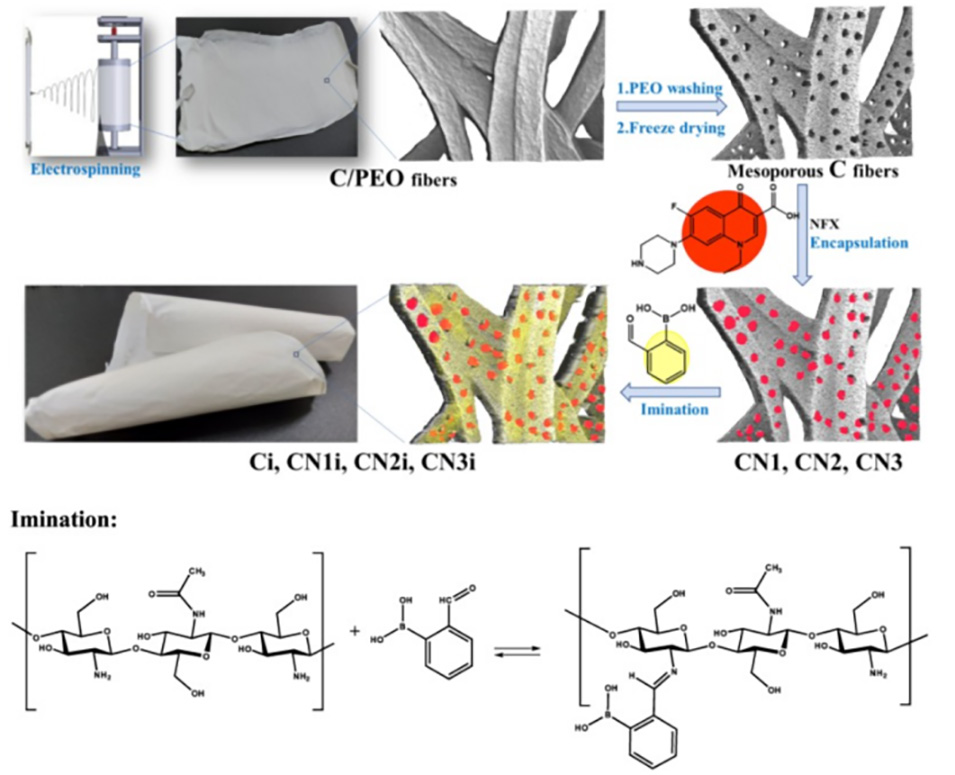 主要内容:使用聚环氧乙烷作为牺牲添加剂,通过静电纺丝制备介孔壳聚糖纤维垫,然后负载诺氟沙星并通过动态亚胺键涂覆抗真菌剂。中孔特性有利于快速吸收高达 17 g/g 的液体,并且生物降解速率适合伤口愈合速率,即在伤口渗出液的 pH 特性介质中质量损失高达 30%,并在正常真皮的 pH 特性中完全降解。复合纤维以受控方式释放 NFX 和 2FPBA,并对革兰氏阳性菌、革兰氏阴性菌和真菌菌株表现出抗菌活性。