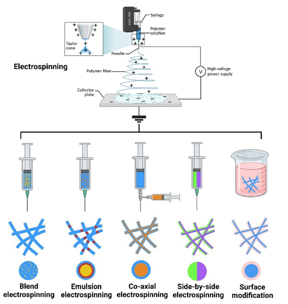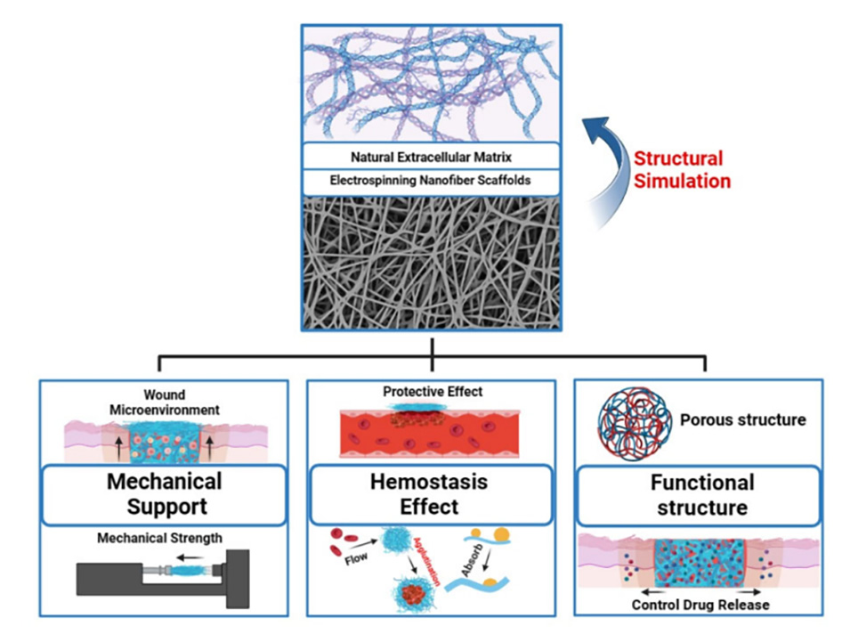 电纺纳米纤维支架具有高比表面积和良好的生物相容性,可作为载体用于控制释放纳米颗粒,从而促进伤口愈合。