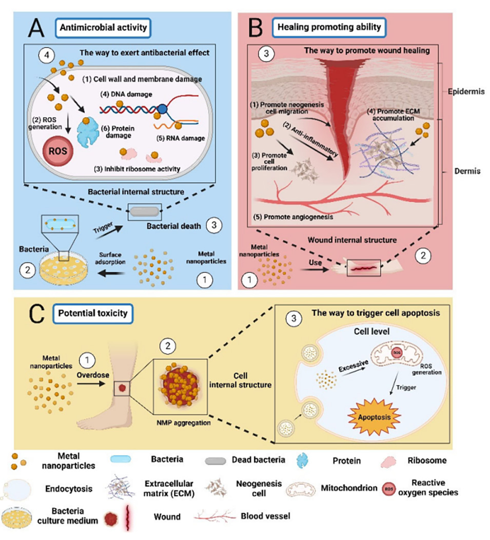 增强的伤口愈合:金属基纳米颗粒具有独特的生物学特性,可以促进伤口愈合,如抗菌、抗炎和抗氧化作用。